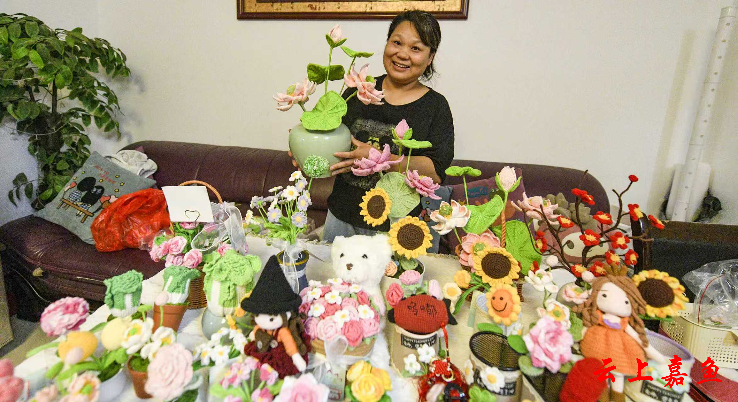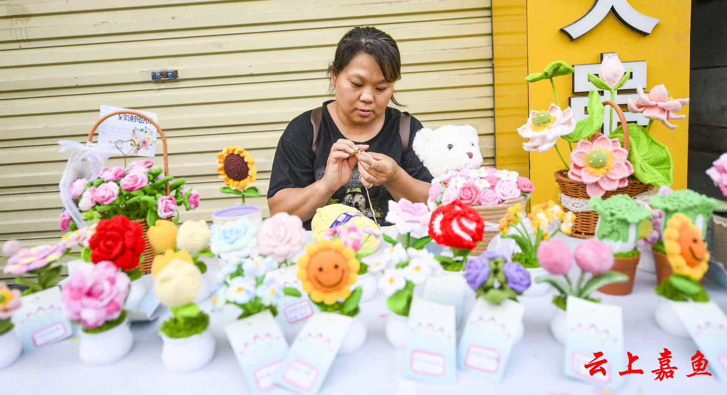 “小时候学织毛衣和钩织鞋子都是向长辈请教学习,后来学习的手工钩织花束、玩偶、发饰、包包等都是网上搜视频教程学习的,后来慢慢学着看图解学习钩织。一开始纯属个人兴趣爱好,后来慢慢尝试摆摊,发现有很多跟她一样喜欢中国传统钩织技艺的女性。”朱利华笑着说道。