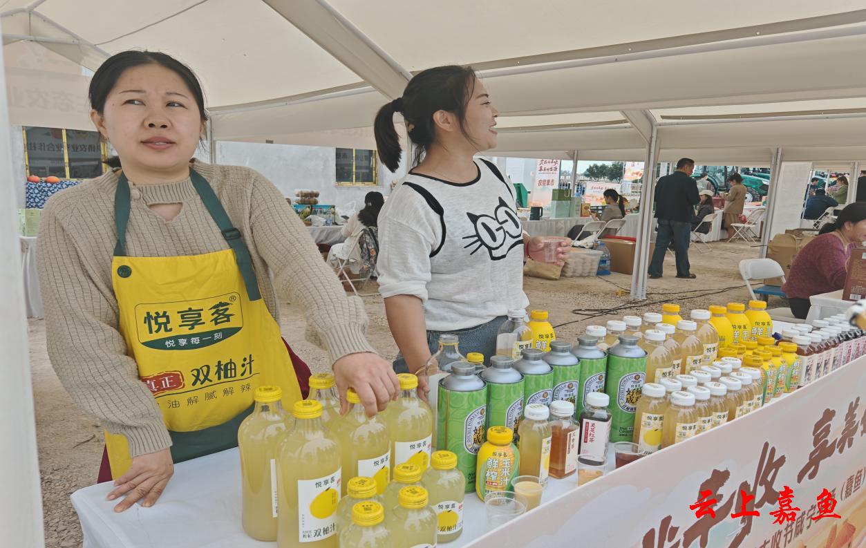 好吉色食品有限公司的展台前展示着公司的各种饮料新品,公司相关负责人介绍,香柚种产销一体化项目将香柚作为“一县一品”进行培育,真正实现联农、带农、富农。