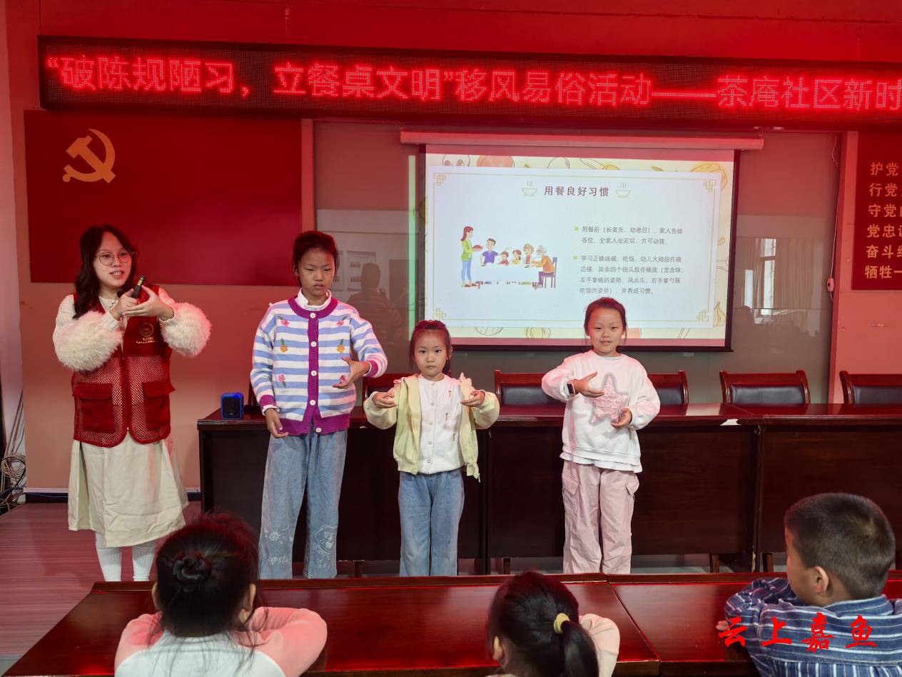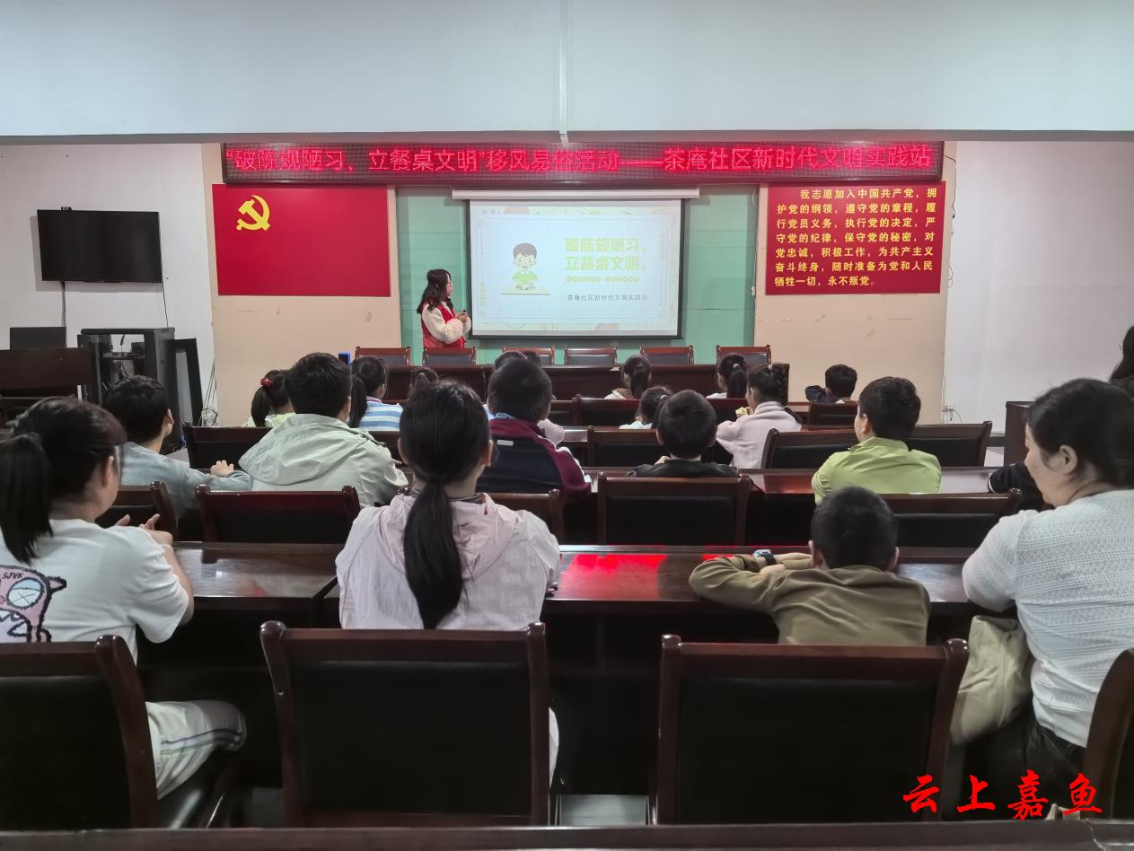 云上嘉鱼报道(通讯员游梦琴)10月18日,鱼岳镇茶庵社区新时代文明实践站联合茶庵社区团委开展“破陈规陋习,立餐桌文明”移风易俗活动,通过趣味互动、实操教学等形式,引导青少年从小树立餐桌文明意识,养成良好生活习惯,让文明新风尚在社区落地生根。