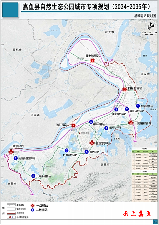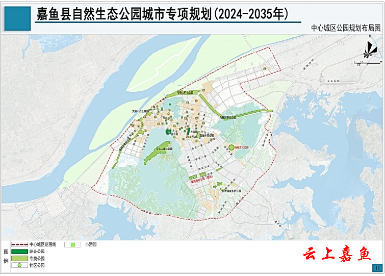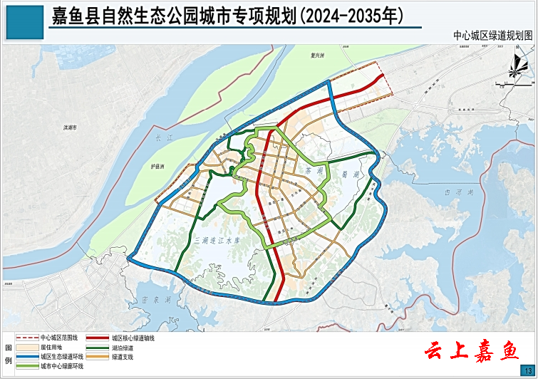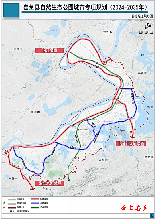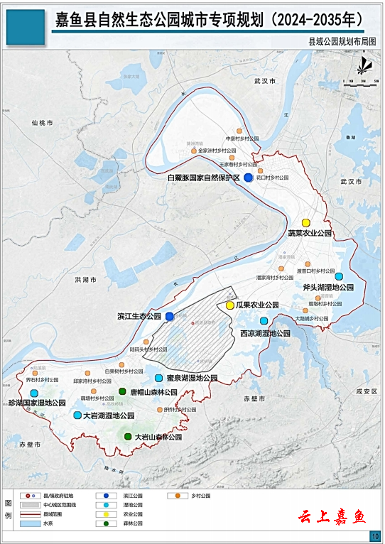 以大江大湖、乡野田园为自然生态基底,融合地域文化资源,按 照全域公园化的理念,将嘉鱼县建设为武汉都市圈滨江自然生态公园 城市。