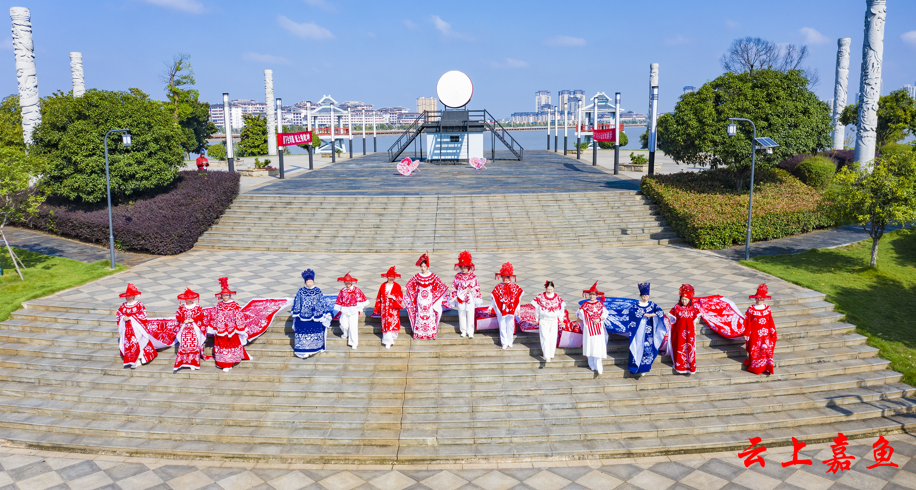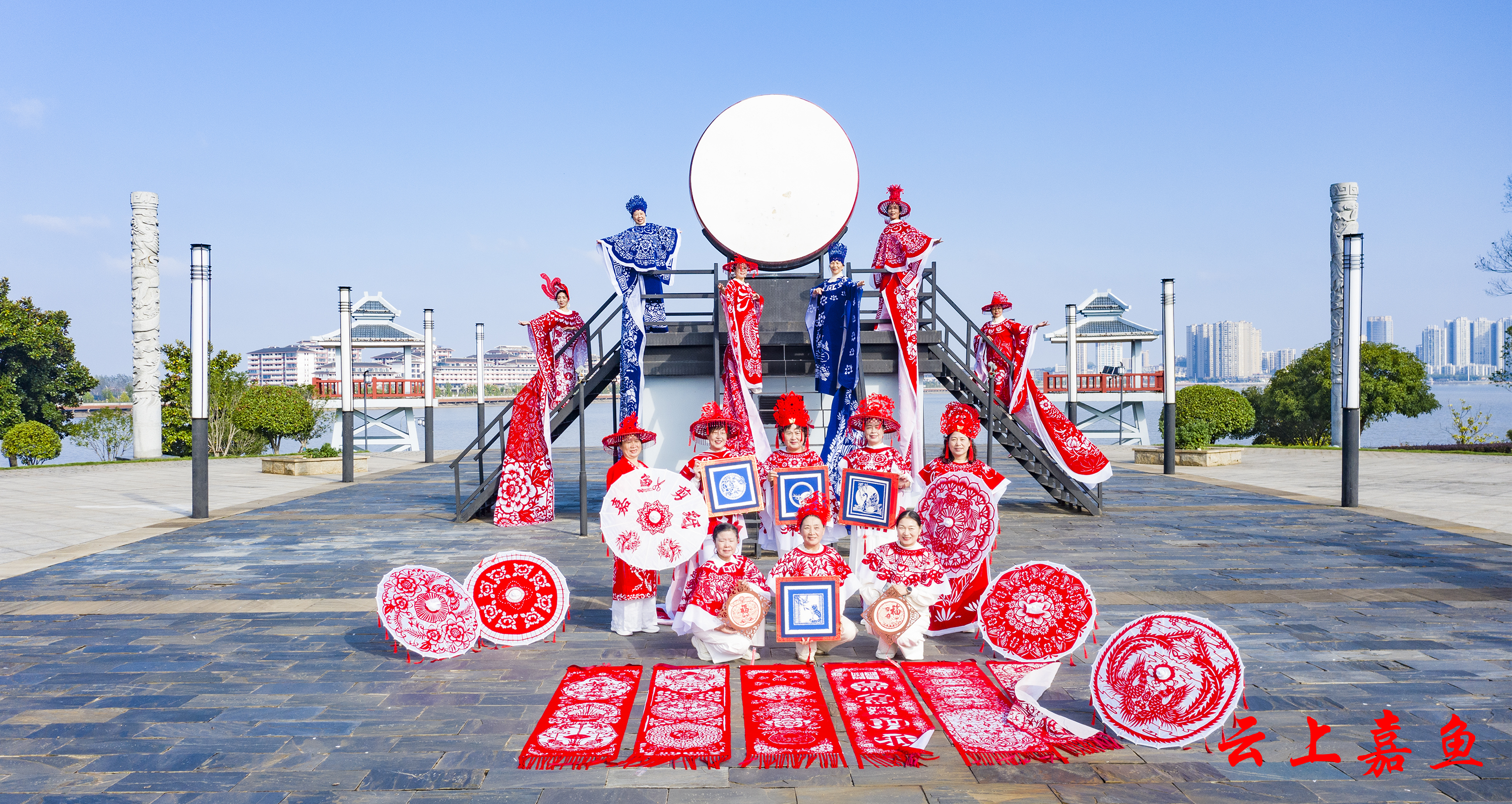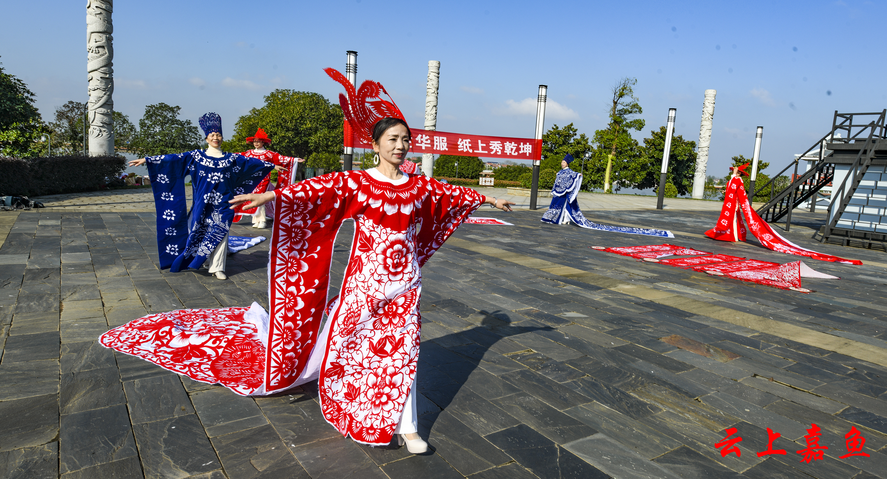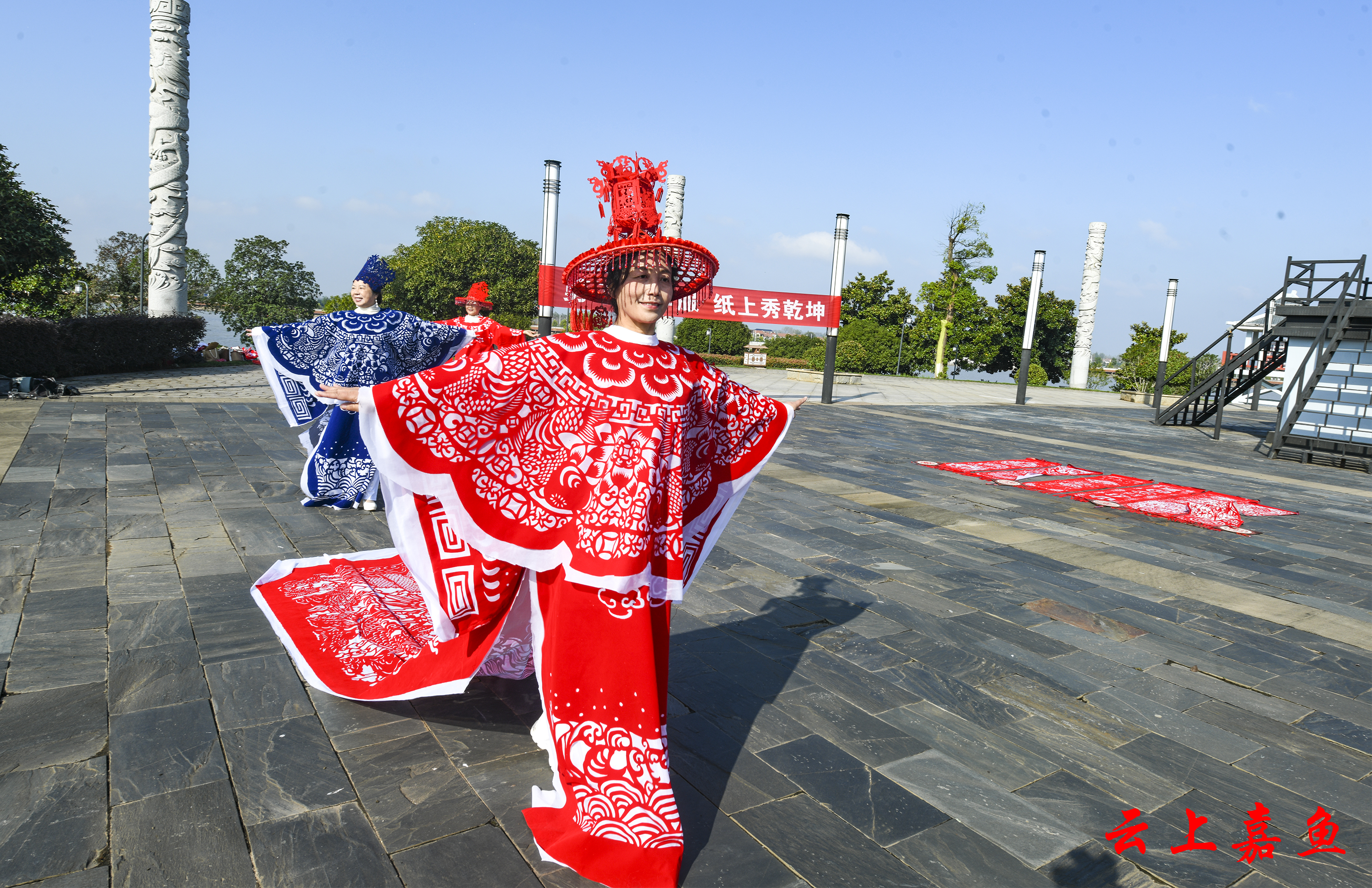 一纸一剪,千年技艺化身流动的艺术。“龙袍起,风云动!”随着非遗传承人手中的金剪轻启,模特身着剪纸华服,款款走向雄风鼓台楼。模特身着3米余长的“龙纹剪纸长袍”拾级而上。蓝色的龙袍以龙与长城为创意,象征着中华民族的坚韧与腾飞。作品通过镂空技法将鳞片、云纹层层叠叠,行走间光影流转,仿佛将流动的史诗穿在身上。而与之呼应的红色“凤冠霞帔”则以嘉鱼二乔公园双凤楼为灵感,表达了嘉鱼人民对幸福美满生活的向往。作品以凤凰展翅的剪影与流苏相映,羽翼舒展,姿态优雅,暗喻“凤凰于飞”的祥瑞,引得游客纷纷举起手机记录。