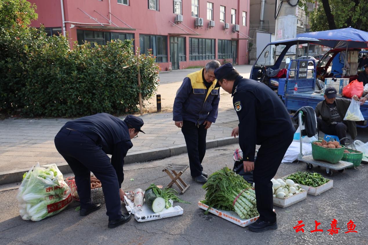 云上嘉鱼报道(全媒体记者夏洋)清晨的考棚村市场,商贩们开始摆摊迎客,嘉鱼县城市管理综合执法大队的队员们也已投入一天的巡查工作。有人协助商户挪动超出白线的货架,有人弯腰拾起地上的菜叶和垃圾袋,还有人将乱停在非机动车道上的电动车轻轻推回停车区域。