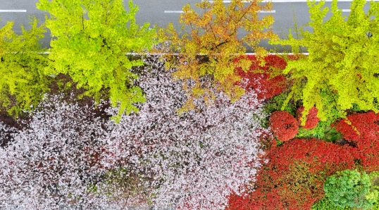 换个视角俯瞰,春的色彩在大地上铺陈开来。白樱似雪,红楠如焰,新绿的树叶像撒在画布上的颜料,层次分明又浑然一体。道路在花海与绿意间若隐若现,把诗经大道的春日,酿成了一杯最醇厚的自然之酒,醉了每一个路过的人。