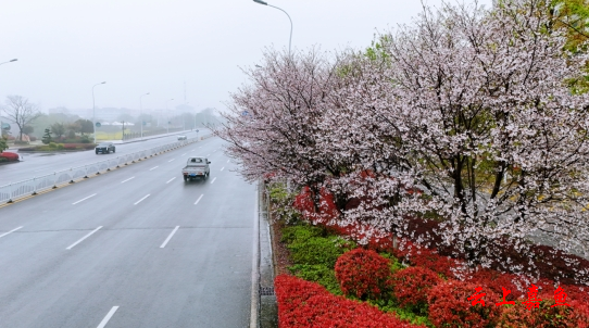 从路面抬眼望去,诗经大道成了樱花的长廊。满树繁花如云似雪,压得枝桠微微低垂,与路边艳红的石楠、鲜绿的灌木交织成锦。湿润的路面映着天光,车辆缓缓驶过,仿佛穿行在一幅流动的春景图里,把嘉鱼的春日浪漫,铺向了远方。