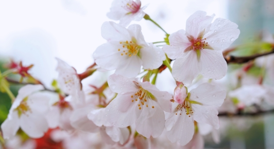 凑近了看,樱花的娇态更显动人。五片花瓣层层舒展,白里透粉的肌理上,水珠滚过,映出细碎的光。鹅黄的花蕊藏在花心,像撒了一把碎金,在朦胧的天光里轻轻颤动。这是春的私语,藏在每一朵花的褶皱里,温柔得能沁进人心底。