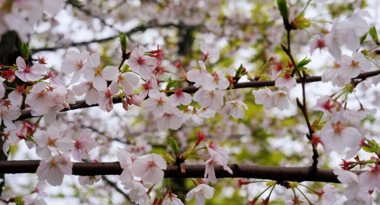 雨雾初歇,诗经大道的樱花便攒着劲儿缀满了枝桠。粉白的花瓣沾着未干的水珠,像刚从江南烟雨中醒来的美人,带着几分慵懒与清润。深褐的枝桠间,新绿的芽尖探出头来,与这一片温柔的粉白相映,把春日的生机揉进了每一缕风里。