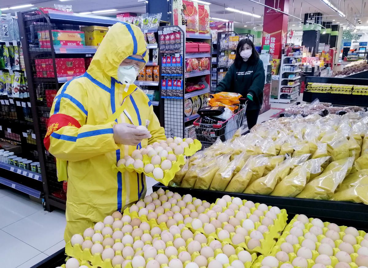 2020年3月16日,武汉市关山街党员志愿者在中百超市为辖区群众代购生活物资。(湖北日报全媒记者 张鸿 通讯员 张宾 汪万军 摄)
