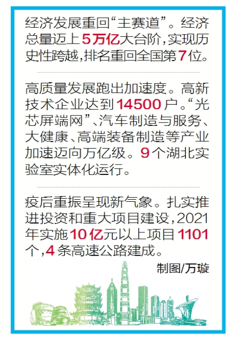 全力答好建成支点“必答题”,全力答好高质量发展“必答题”,全力答好省域治理“必答题”。湖北营商环境“金字招牌”越擦越亮,实施“一主引领、两翼驱动、全域协同”区域发展布局成势见效;搭建科技强省“四梁八柱”,“51020”现代产业体系强筋壮骨;打造疾控体系改革和公共卫生体系建设“湖北样板”,构建党建引领的共建共治共享社会治理格局,荆楚儿女以实干回报关怀,以行动践行责任。