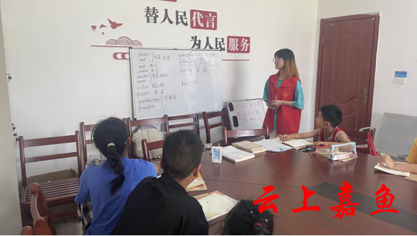 云上嘉鱼报道(通讯员梁宁)“离离原上草,一岁一枯荣。来,大家跟我一起读……”7月26日上午,在新街镇晒甲山村村委会一楼的“希望家园”教室中,两名大学生志愿者正在教小朋友们读古诗。