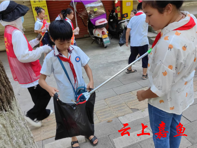 云上嘉鱼报道(通讯员李静)7月29日,团县委、鱼岳镇团委组织“红领巾”志愿服务队、东街社区青年志愿服务队开展志愿服务活动。志愿者们冒着酷暑、顶着烈日,在街头清理垃圾、帮助老人,形成了一道靓丽的风景线。