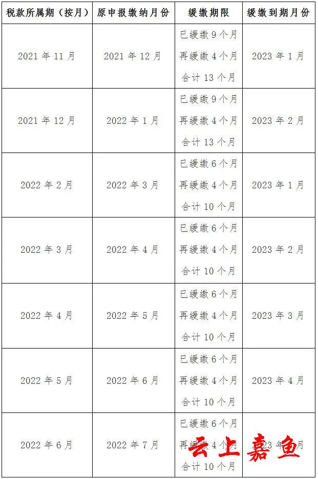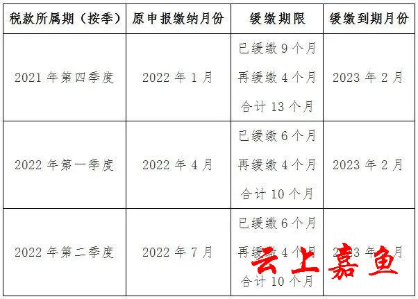 所属期是2021年11月、12月(包括按季缴纳的2021年第四季度税费)缓缴税费在延长9个月的基础上继续延长4个月(合计延长13个月),分别在2023年1月、2月入库。