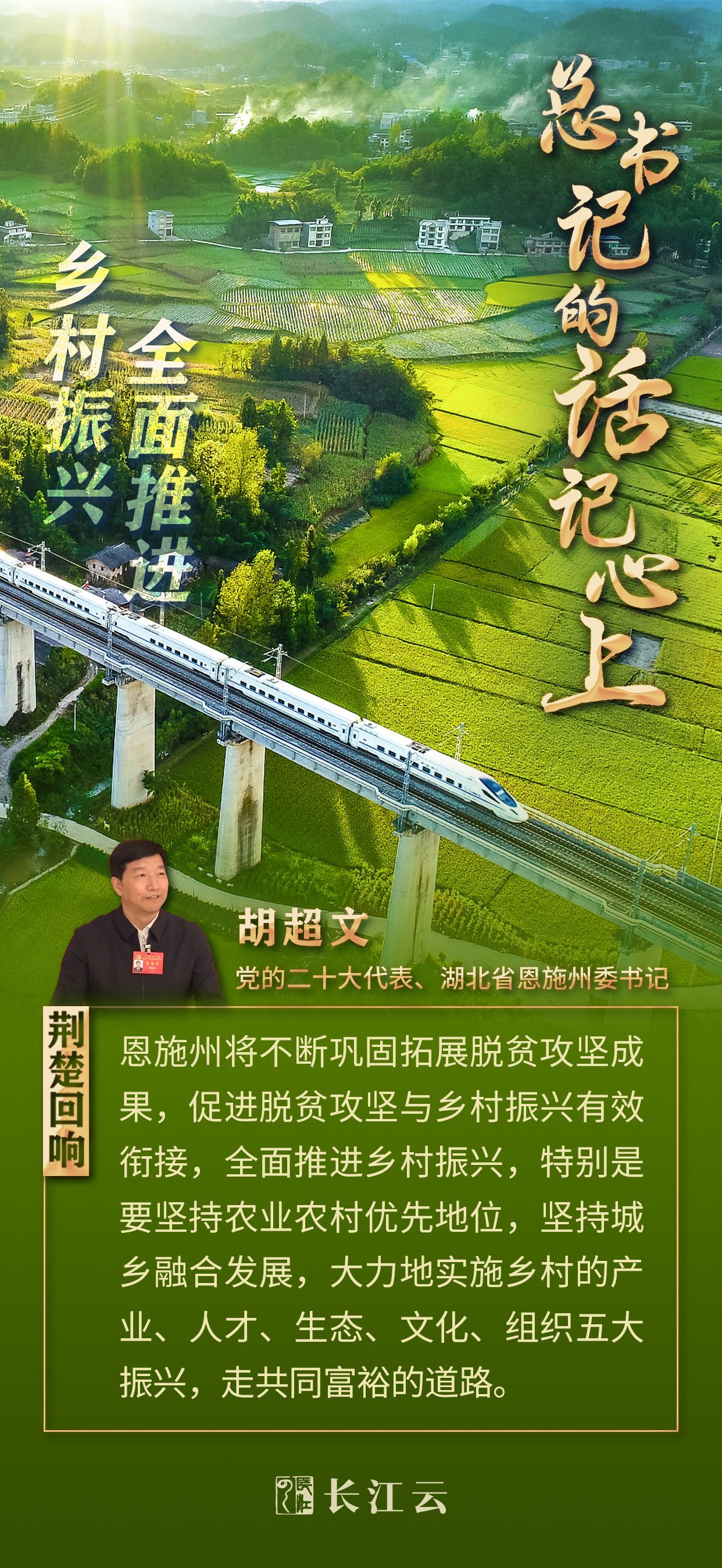 党的二十大代表、湖北省恩施州委书记胡超文:习近平总书记在二十大报告中讲,全面建设中国式的现代化,最繁重、最艰巨的任务仍然在农村。恩施州曾经是全域贫困地区,我们将认真宣传好、落实好会议的精神,不断巩固拓展脱贫攻坚成果,促进脱贫攻坚与乡村振兴有效衔接,全面推进乡村振兴,特别是要坚持农业农村优先地位,坚持城乡融合发展,大力地实施乡村的产业、人才、生态、文化、组织五大振兴,走共同富裕的道路。