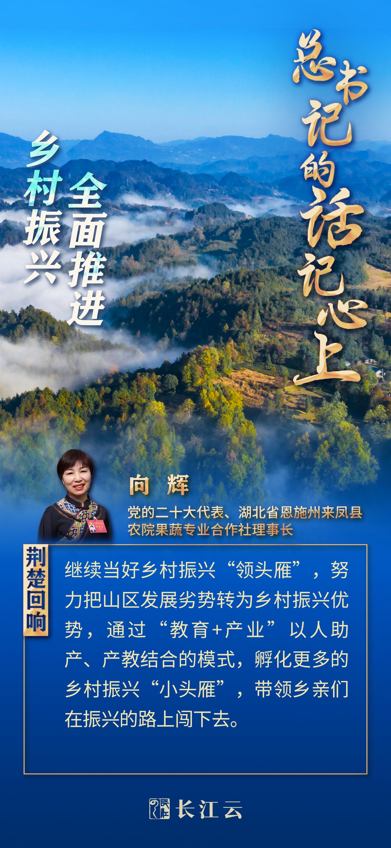 党的二十大代表、湖北省恩施州来凤县农院果蔬专业合作社理事长向辉:这让我倍感振奋。作为党的二十大代表,光荣与使命同在。我会继续当好乡村振兴“领头雁”,努力把山区发展劣势转为乡村振兴优势,通过“教育+产业”以人助产、产教结合的模式,孵化更多的乡村振兴“小头雁”,带领乡亲们在振兴的路上闯下去。