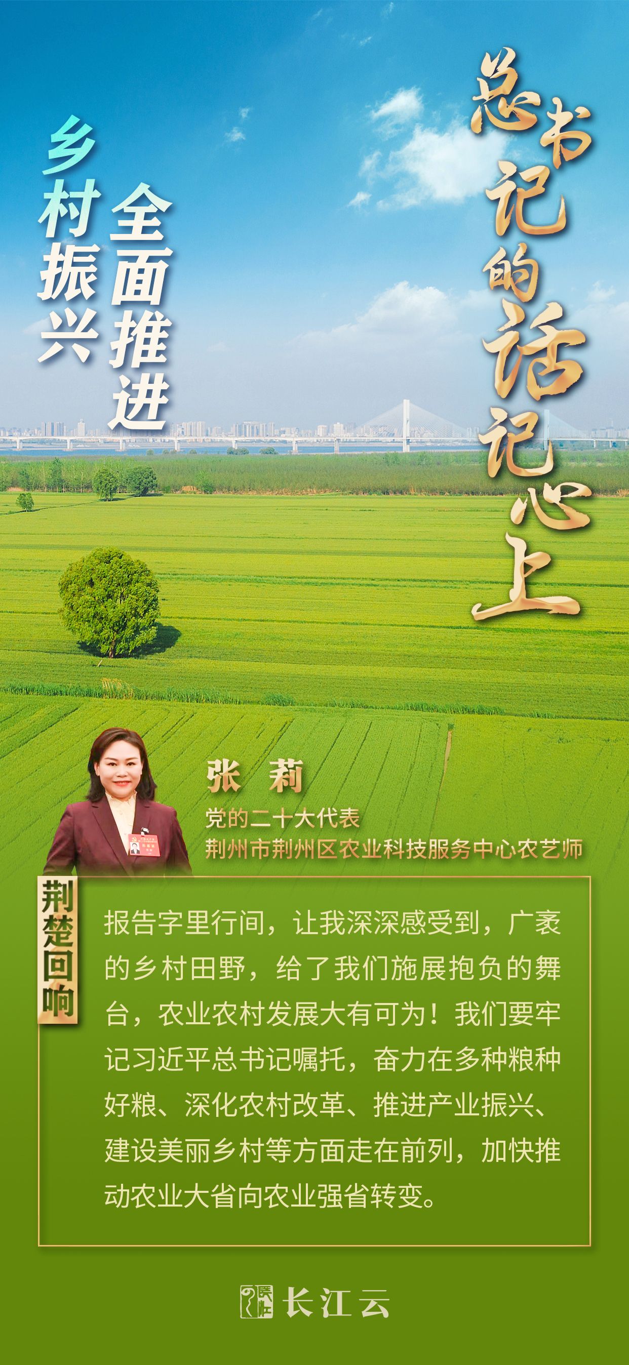党的二十大代表、荆州市荆州区农业科技服务中心农艺师张莉:报告字里行间,让我深深感受到,广袤的乡村田野,给了我们施展抱负的舞台,农业农村发展大有可为!我们要牢记习近平总书记嘱托,坚决扛稳粮食安全“国之大者”政治责任,落实最严格的耕地保护制度,加大高标准绿色农田建设力度;深入实施种业振兴行动;加快新品种、新技术、新模式应用推广;推进农业农村现代化与数字化、科技化深度融合,加大品牌培育力度,培育壮大新型经营主体,推进产业规模化、特色化发展,奋力在多种粮种好粮、深化农村改革、推进产业振兴、建设美丽乡村等方面走在前列,加快推动农业大省向农业强省转变。