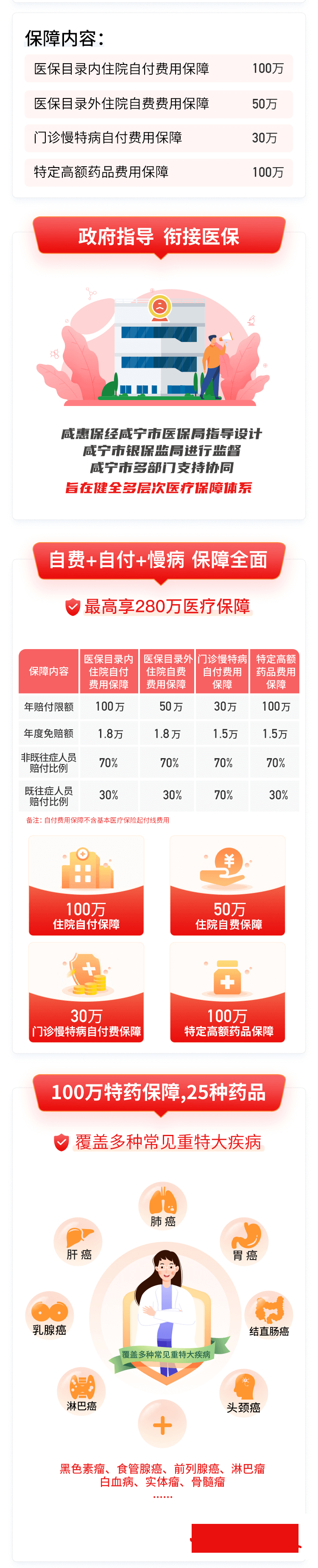 “咸惠保”由咸宁市医疗保障局联合政府多部门指导、中国银保监会咸宁监管分局监督,紧密衔接基本医保和大病保险的普惠型补充医疗保险。助力于咸宁市医疗保障水平,为参保人带去实惠、安心和保障,减少因病致贫、返贫现象。