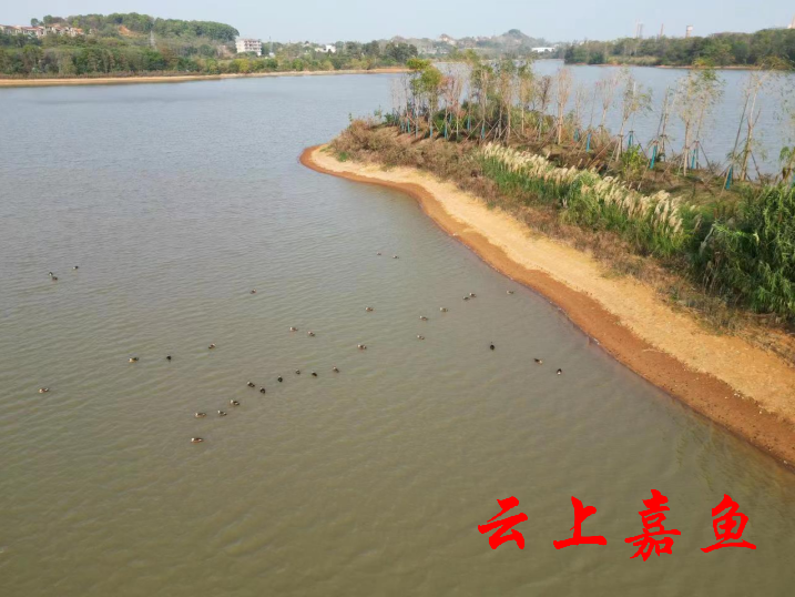 远处,“嘎!嘎!嘎!”湖中三五成群的野鸭在欢快嬉戏,野鸭的颜色各异,白的、黑的、黑白相间的,好似在呼喊同伴,又好似在说:“嘉鱼欢迎你,小湖欢迎你!”