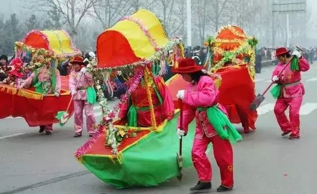 划旱船,民间传说是为了纪念治水有功的大禹的。旱船不是真船,多用两片薄板,锯成船形,以竹木扎成,再蒙以彩布,套系在姑娘的腰间,如同坐于船中一样,手里拿着桨,做划行的姿势,一面跑,一面唱些地方小调,边歌边舞,这就是划旱船。