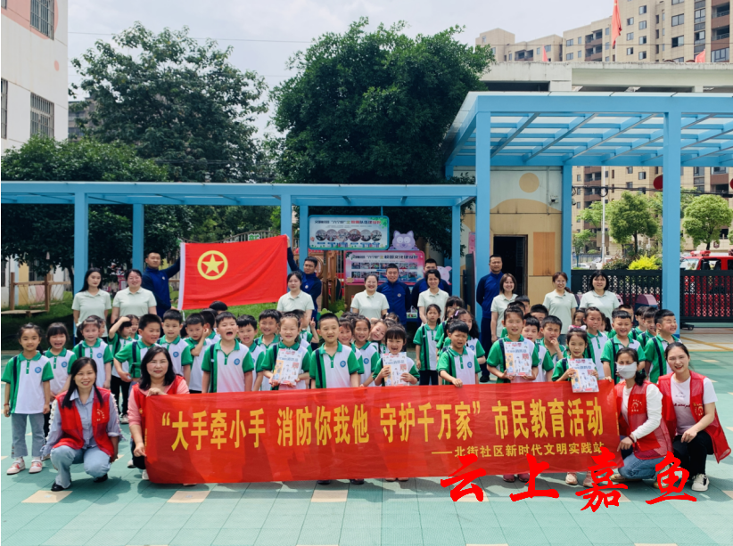 云上嘉鱼报道(全媒体记者祁声坤 通讯员郑春霞)5月23日,鱼岳镇北街社区新时代文明实践站联合社区团委、文庙山微型救援站在鱼岳幼儿园开展“大手牵小手 消防你我他 守护千万家”教育活动。