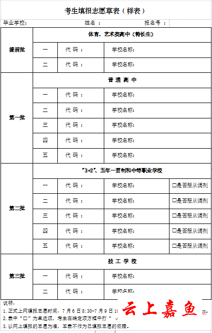 今年中考共设4个批次志愿栏目。提前批设特长生2个梯度志愿;第一批设普通高中5个平行志愿;第二批设包括“3+2”、五年一贯制专业和中职学校5个平行志愿;第三批设技工学校2个平行志愿。“考生填报志愿草表”(样表)如下: