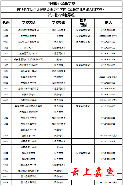 所有考生除了可以填报本地高中教育阶段招生学校外,还能填报招生范围为面向全市招生的学校(包括中职)。温泉城区学校的考生还可填报咸宁高中在温泉城区的分配生计划志愿及咸安区其他高中学校。各县(市、区)考生皆可填报鄂高国际班计划志愿。