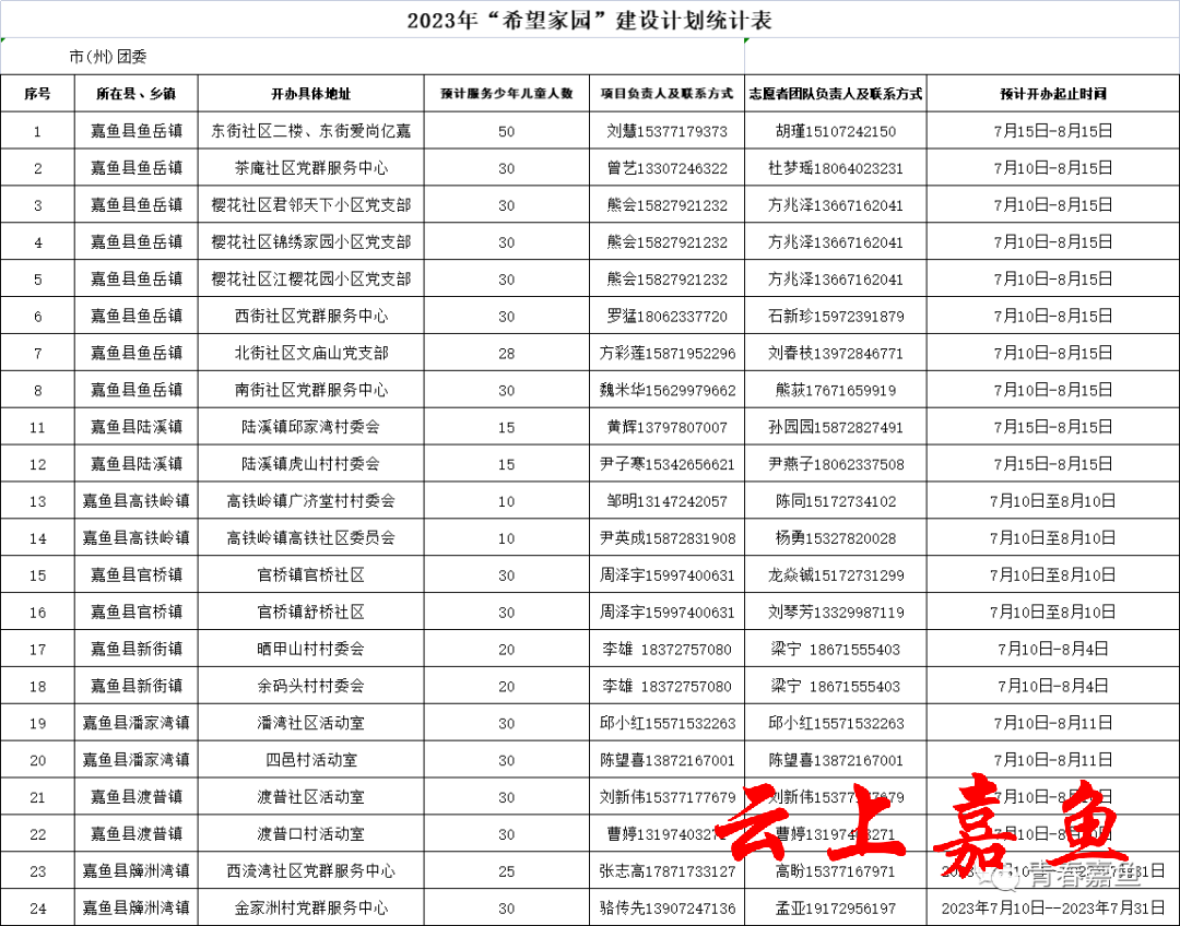 为了让孩子们度过一个愉快而有意义的暑假,共青团嘉鱼县委将在多个乡镇广泛开展2023年暑期少年儿童“希望家园”活动,号召青年志愿者与家长们共同关爱进城务工子女及留守儿童。