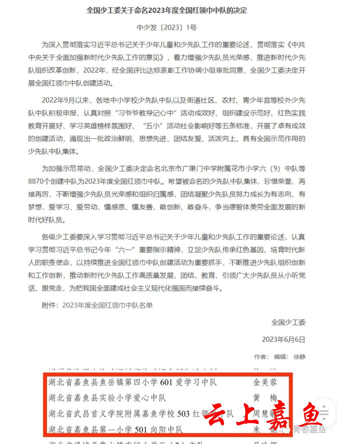 近日,全国少工委发布《关于命名2023年度全国红领巾中队的决定》,其中嘉鱼县实验小学爱心中队、嘉鱼县鱼岳镇第四小学601爱学习中队、武昌首义学院附属嘉鱼学校503中队、嘉鱼县第一小学501向阳中队等4个少先队中队被命名为2023年度全国红领巾中队。