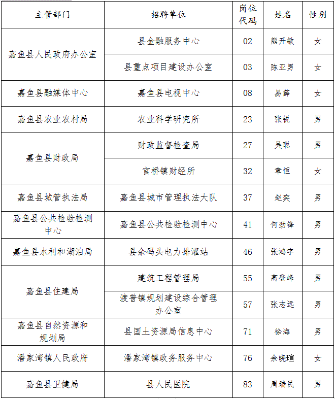 根据《2023年嘉鱼县事业单位公开招聘工作人员公告》要求,全县事业单位公开招聘工作人员工作经笔试、面试、体检和考察,现将第二批拟聘用的14人予以公示,公示期为7个工作日,从2023年7月11日起至2023年7月19日,名单如下: