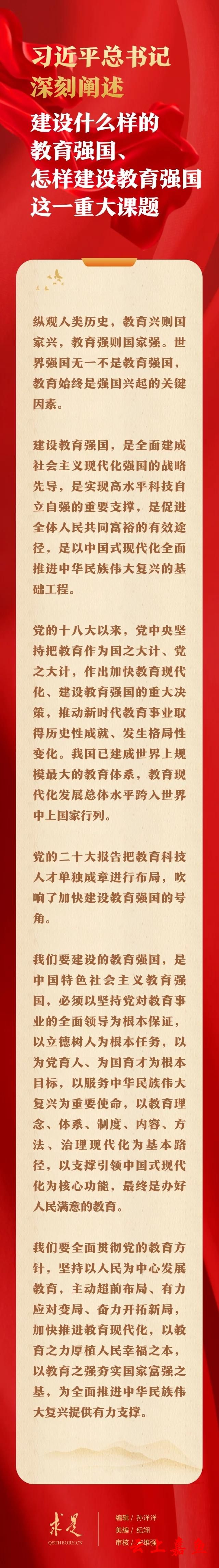 9月16日出版的第18期《求是》杂志刊发习近平总书记重要文章《扎实推动教育强国建设》。在这篇重要文章中,总书记从“培养担当民族复兴大任的时代新人”、“加快建设高质量教育体系”、“全面提升教育服务高质量发展的能力”、“在深化改革创新中激发教育发展活力”、“增强我国教育的国际影响力”、“培养高素质教师队伍”6个方面,对扎实推动教育强国建设提出明确要求。