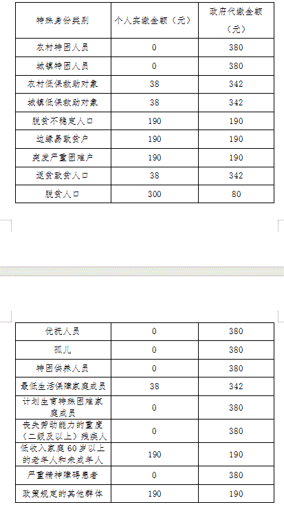 (二)特殊身份居民缴费标准及政府资助标准见下表: