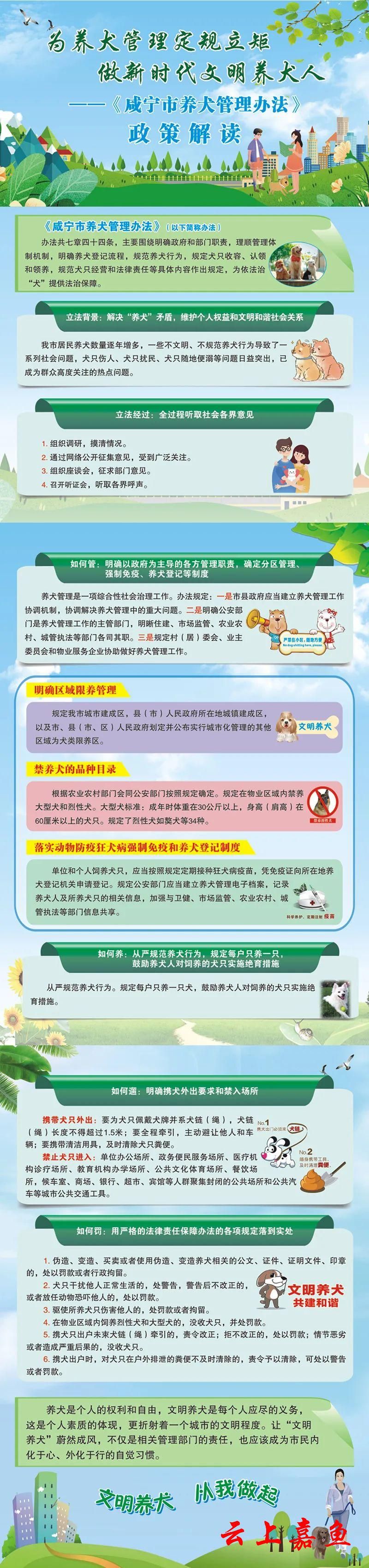 一、依法依规,规矩养犬。请自觉遵守《咸宁市文明行为促进条例》《咸宁市养犬管理办法》等有关规定,持身份证、房产证或者租房合同、犬只免疫证等材料,携犬只到居住地所在地的公安机关申请办理养犬登记。饲养犬只必须进行登记,且一户最多饲养一只。不得饲养大型犬(成年时体重在30公斤以上或者身高(肩高)超过60厘米)、烈性犬(5类34个品种)。