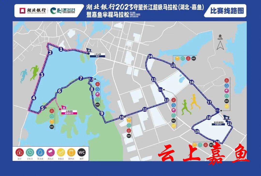 2023守望长江超级马拉松嘉鱼站赛道经过重新选定,起点仍为二乔公园,终点改为武汉东湖学院北门。赛道线路经过改进后,沿途风景更优美,赛道更平缓,终点广场更开阔,更利于参赛选手刷新PB!