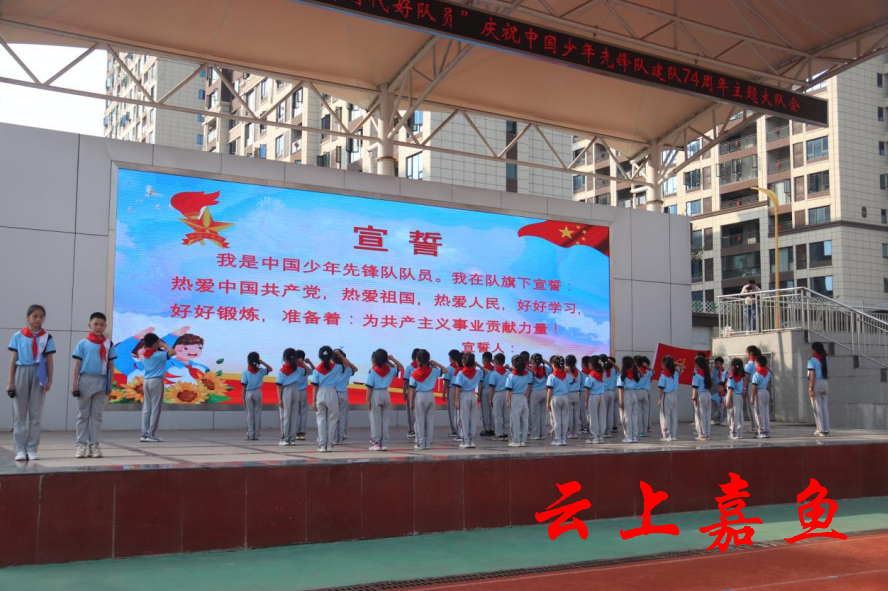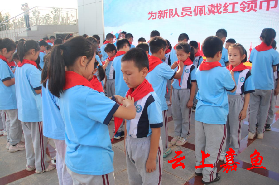 “我是中国少年先锋队队员。我在队旗下宣誓:我热爱中国共产党、热爱祖国、热爱人民、好好学习、好好锻炼……”在建队节当天,嘉鱼县实验小学共有487名同学新加入中国少年先锋队组织,老队员们共同为新队员佩戴红领巾并宣誓,从此刻起,新队员也将扛起少先队员的历史使命。