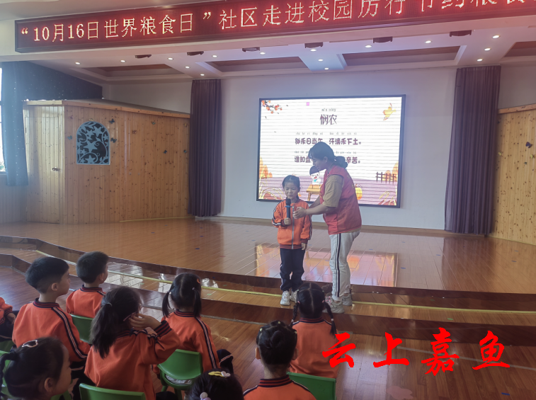 云上嘉鱼报道(全媒体记者雷佳敏)2023年10月16日是第43个世界粮食日,为教育广大幼儿养成文明节约的良好习惯,在心中种下“勤俭节约”的种子,鱼岳镇东街社区新时代文明实践站联合安琪幼儿园开展“节约粮食 从小做起”世界粮食日主题宣传活动。