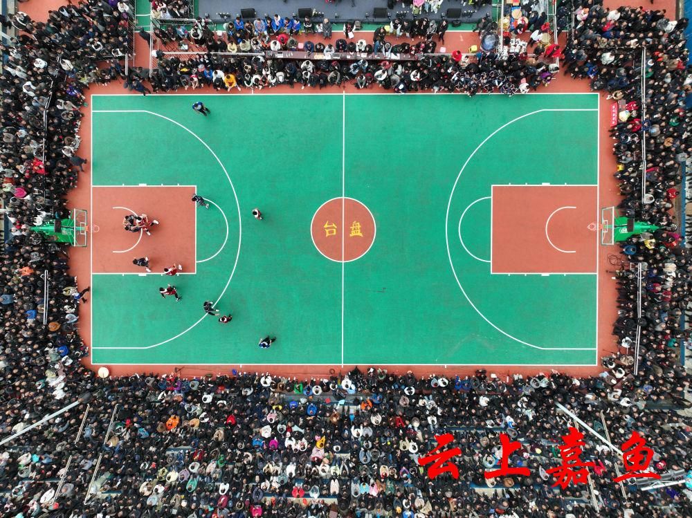 这是2023年3月27日在贵州省黔东南州台江县台盘村拍摄的贵州省首届“美丽乡村”篮球联赛总决赛比赛现场(无人机照片)。新华社记者 欧东衢 摄