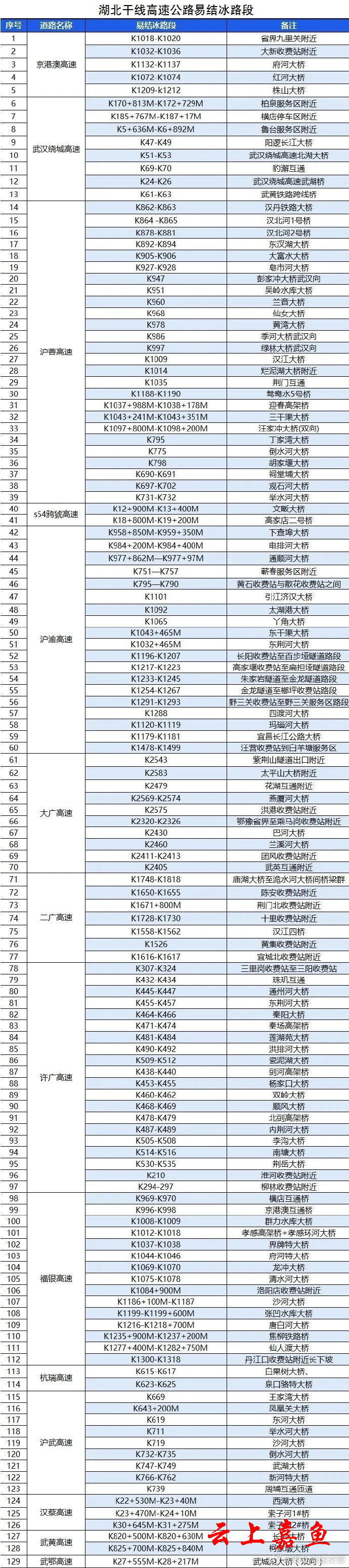 可能受结冰影响的高速路段有↓↓↓1.福银高速十堰段
