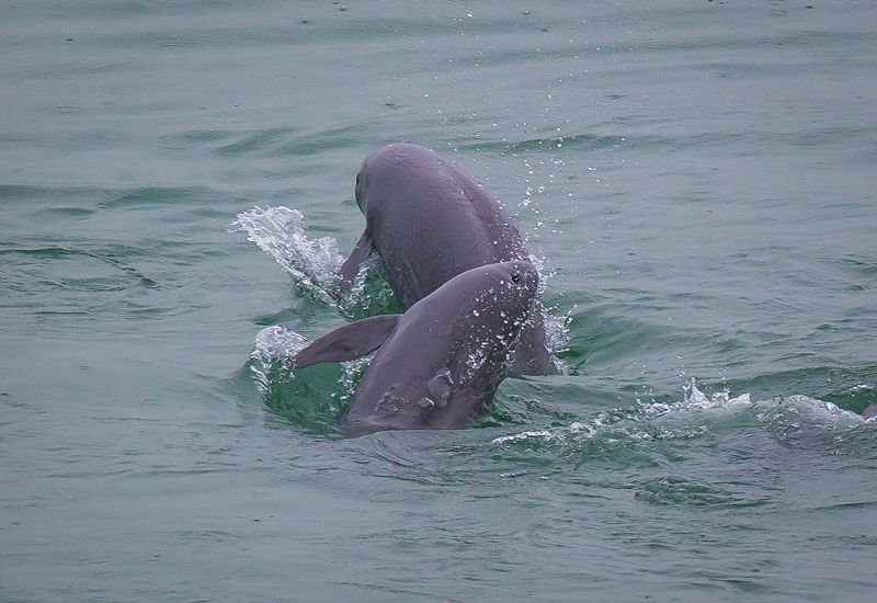 2021年5月10日,在湖北宜昌江边,长江江豚在水中嬉戏。