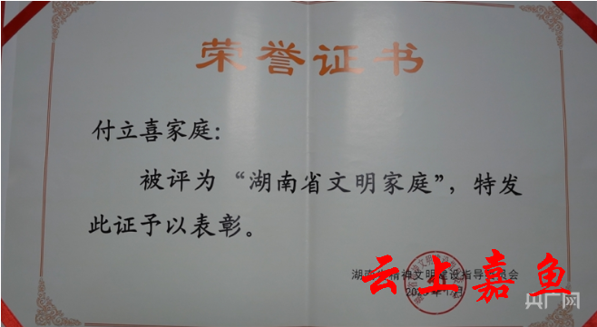 湖南省“文明家庭”的荣誉证书(央广网发 唐芳艳 供图)