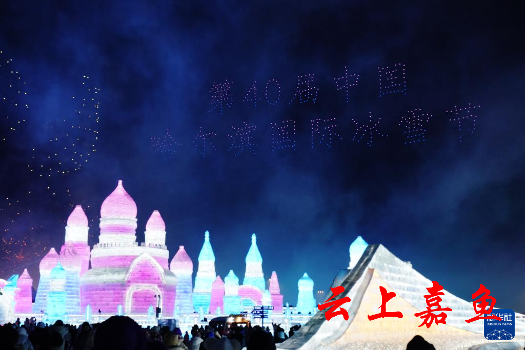 1月5日,在哈尔滨冰雪大世界园区,游客在观看哈尔滨国际冰雪节开幕式上的无人机表演。当日,第40届中国·哈尔滨国际冰雪节开幕,吸引众多游客。新华社记者 王建威 摄