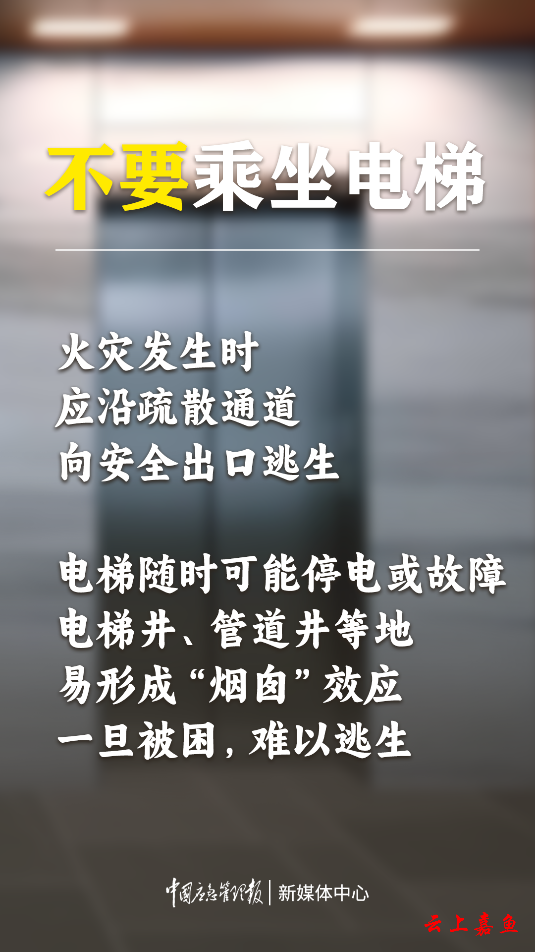 3.切勿乘坐电梯,电梯随时可能因火势蔓延,引发停电或者故障。