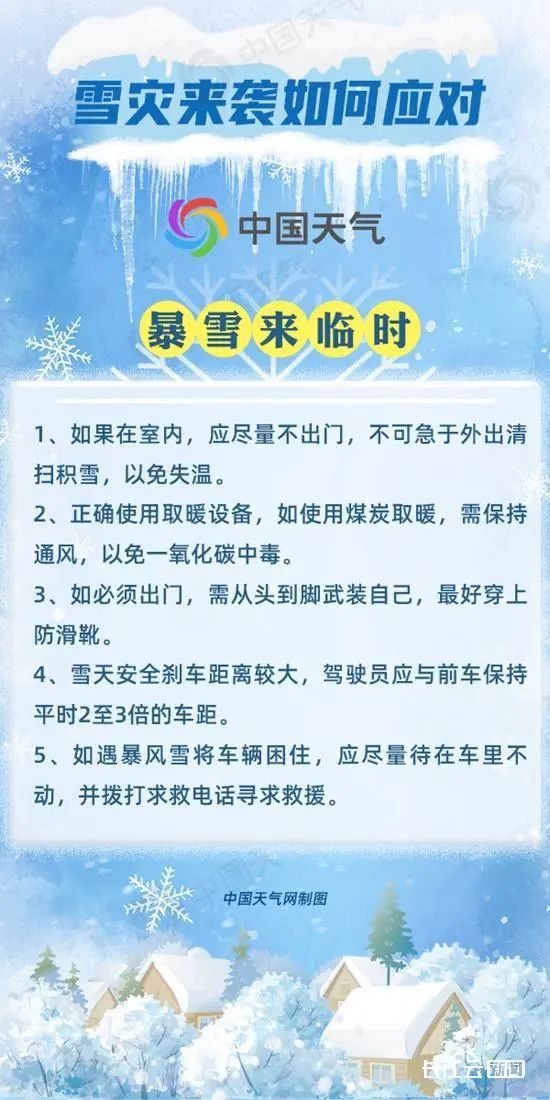 气象部门建议,暴雪天气来临时,及时关注气象预警预报以及高速、机场延误等交通信息,及时调整出行计划;还要做好方案保暖准备,储备充足的食物和水;从危房或不结实的建筑物内转移至安全地带。