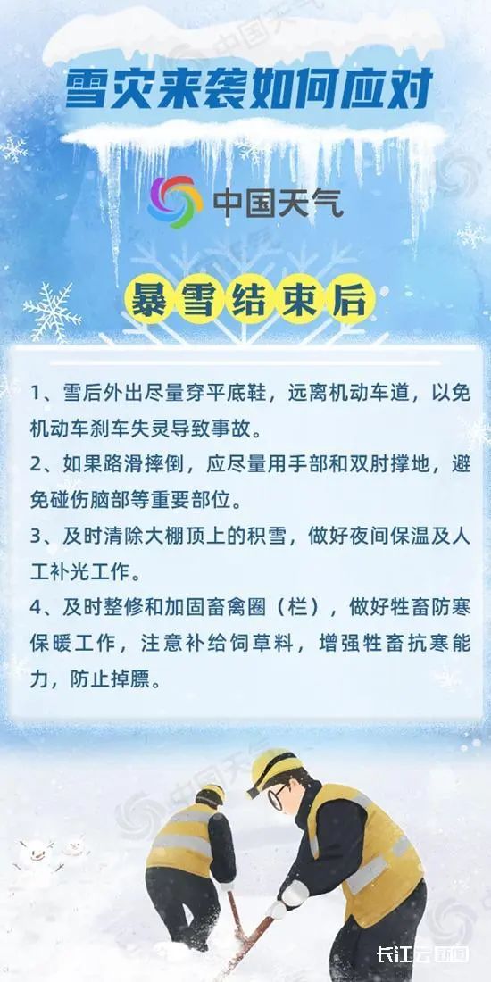暴雪结束后,出门尽量穿平底鞋,远离机动车道;如果摔倒,应尽量用手部或双肘撑地,以免摔伤脑袋等重要部位;在牧区,牧民需及时修理或重新搭建圈棚,并注意饲料补给,谨防牲畜掉膘。