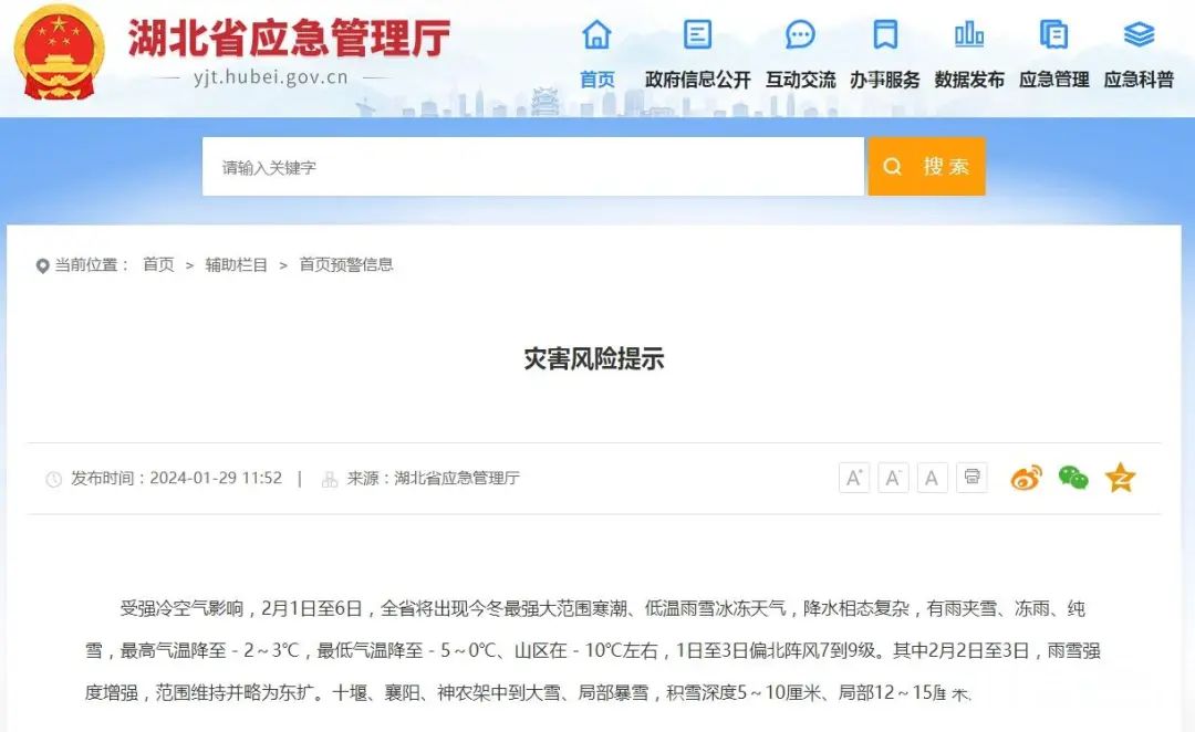 刚刚,湖北省应急管理厅、湖北省减灾委办公室发布风险提示,指出此次低温雨雪冰冻天气范围广、时间长、相态复杂,恰逢我省“两会”和春运期。各地各部门要扎实做好应对低温、大风、雨雪冰冻等极端天气的各项准备。