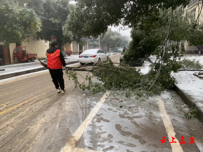 街道上,随处可见的是党员干部、志愿者、沿街商铺的店主,大家都在铲雪扫雪,到处都是忙碌的身影,努力为群众出行保驾护航。“这一段是我们包保的路面,一大早我们就来拿着铁锹铲雪了,结了冰的断树相当重,费了好大劲才搬走,可不能影响大家出行。”社区干部徐建说道。