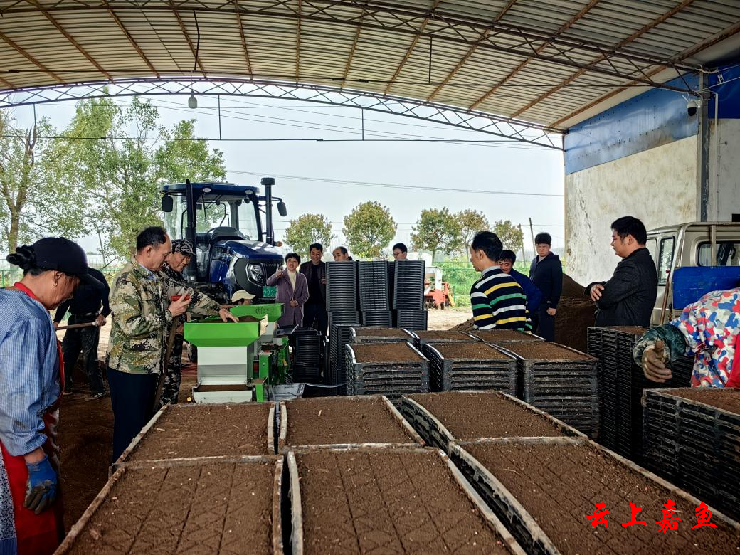 在位于陆溪镇的嘉鱼县泽海种植专业合作社,工人正积极开展机械化集中育秧,经过摆盘、撒土、浇水、播种、盖土、出盘,整个工序流程不超过20秒,一个育秧盘就播种完成了。(熊熙 摄)