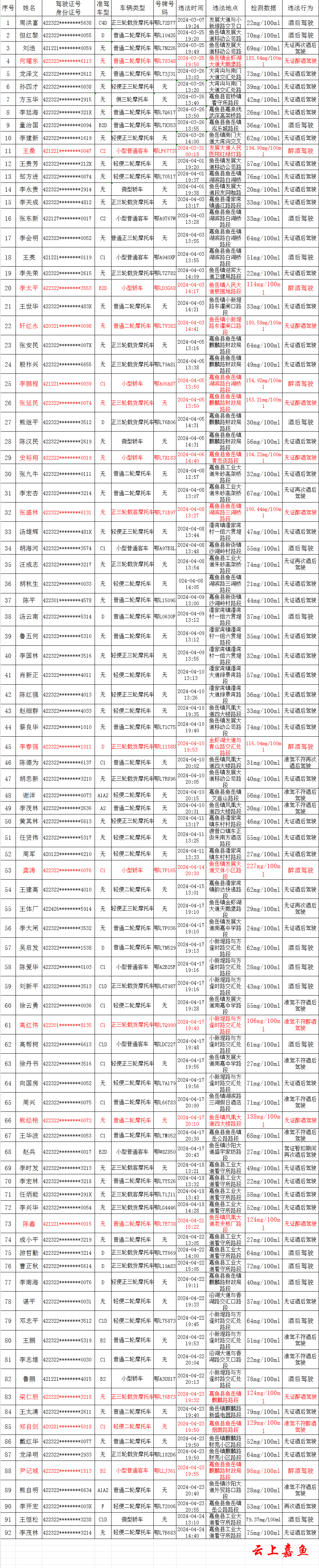 嘉鱼县公安局交警大队查处酒醉驾行动曝光台2024年第4期。下列人员因酒醉驾违法犯罪行为被公安机关依法查处,被处以暂扣驾驶证6个月和吊销驾驶证,5年内不能重新申领等处罚。驾驶证暂扣和吊销期间不得驾驶机动车,望广大居民对下列人员进行监督,一旦发现下列违法人员有驾驶机动车行为的请立即向公安机关举报。对举报违法行为经公安机关查实的,给予举报人奖励500元。举报电话:0715-6351271。