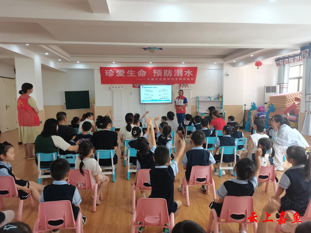 云上嘉鱼报道(全媒体记者邓丹 通讯员周露黎)6月20日,嘉鱼县红十字会携手小湖社区新时代文明实践站、小湖社区团支部、蓝天救援志愿服务队,走进百佳幼儿园,开展了一场主题为“珍爱生命 预防溺水”的防溺水、学自救安全教育活动,向幼儿及其家长传授预防溺水的相关知识。