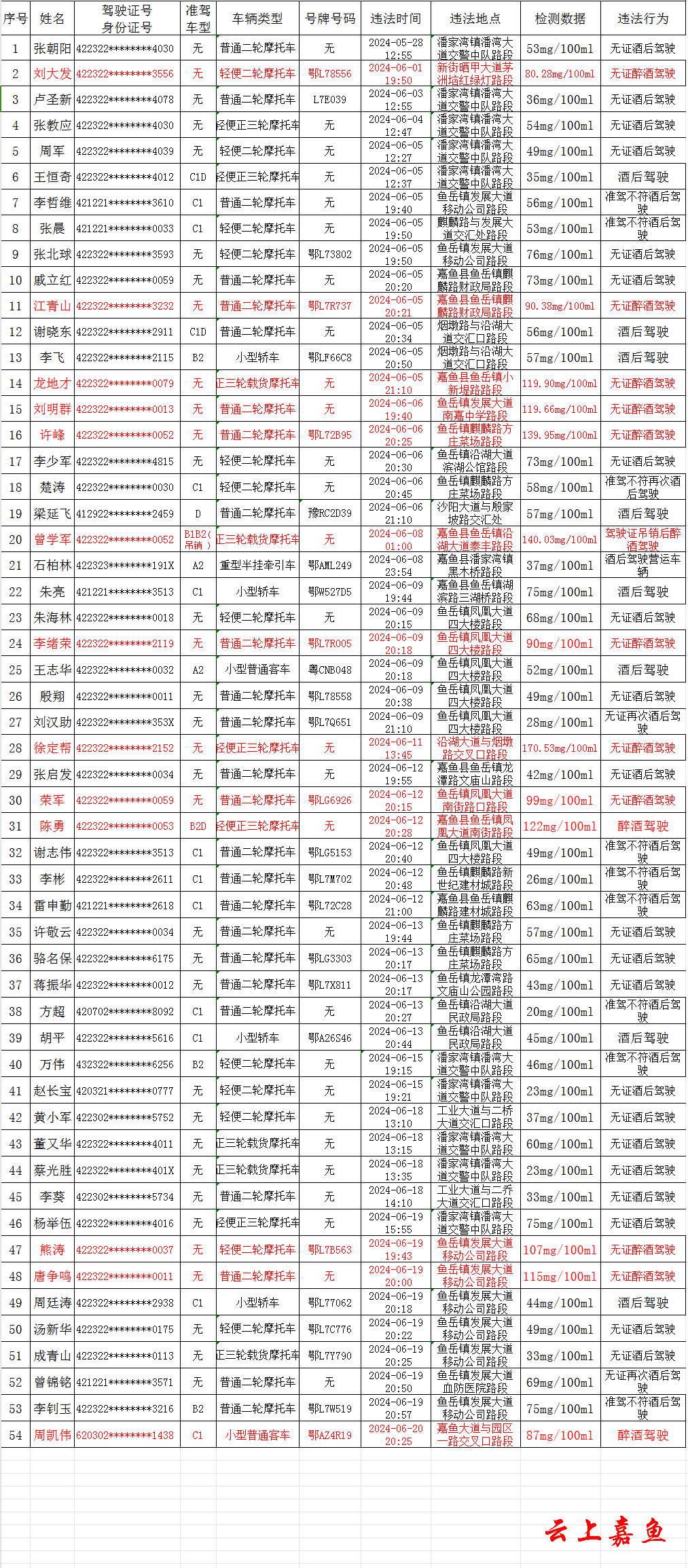 嘉鱼县公安局交警大队查处酒醉驾行动曝光台2024年第6期。下列人员因酒醉驾违法犯罪行为被公安机关依法查处,被处以暂扣驾驶证6个月和吊销驾驶证,5年内不能重新申领等处罚。驾驶证暂扣和吊销期间不得驾驶机动车,望广大居民对下列人员进行监督,一旦发现下列违法人员有驾驶机动车行为的请立即向公安机关举报。对举报违法行为经公安机关查实的,给予举报人奖励500元。举报电话:0715-6351271。