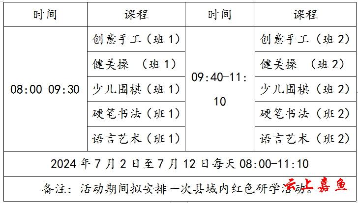 2024年6月28日上午09:00开始网上报名,报满即止2024年7月1日9:00-12:00;15:00-18:00在嘉鱼县青少年校外活动中心大门(嘉鱼县第一初级中学南门)进行资格审查并现场办理报名手续。