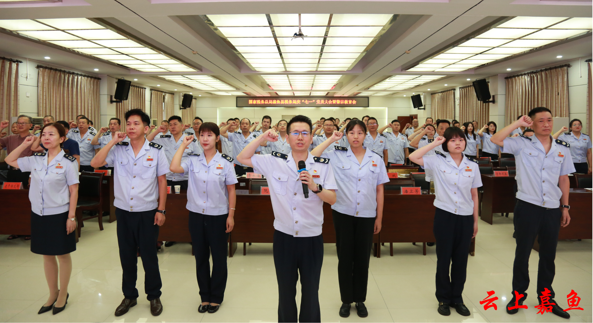 云上嘉鱼报道(全媒体记者雷威 通讯员郭松林)6月28日上午,嘉鱼县税务局召开“严明党纪 锤炼党性”庆“七一”党员大会暨警示教育会。县局领导班子成员、局机关全体党员、各分局党支部委员、老干部党支部代表、青年干部代表等90余人参加会议。