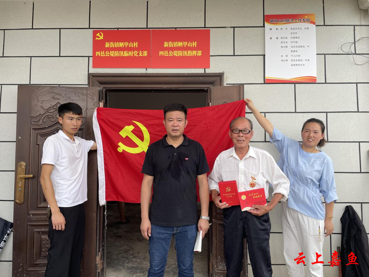 活动中,全体党员高唱国歌、诵读党章、重温入党誓词,新街镇晒甲山村党总支书记徐升为老党员颁发“光荣在党50年”纪念章,以此鼓励在场的年轻党员,要传承老一辈共产党员的光荣传统和优良作风,坚定信念,凝聚力量,勇于在防汛救灾一线亮身份、挑重担、作表率,充分发挥党员先锋模范作用,筑牢防汛“安全堤”。